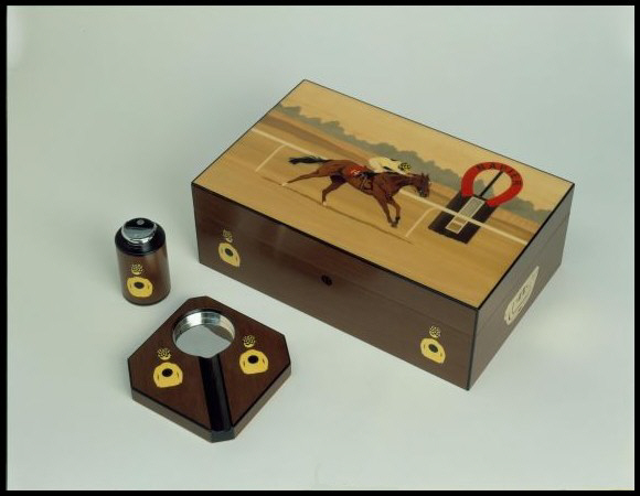 ![]() ![]() Racehorse Humidor ChestThe humidor is veneered with mansonia from the Ivory Coast, and has ebony inlay lines at the edges and an ebony escutcheon. The racehorse and racng colours are knife-cut marquetry by John Burrell.To formulate this unique design, various timbers are used. The background of the marquetry picture is magnolia, maple and walnut using different shades and types of grains to give the depth of field. The sand scorching of certain pieces creates the shading. The horse is in African mahogany and the racing colours are in sycamore. The interior is lined with Belize cedar and has a lift-out tray and moveable partitions. There are two humitecs, a cutter and a hygrometer fitted into the lid. The accessories consist of an ashtray, which has a silver dish, and a lighter, both of which are made in materials to match the humidor. The humidor and the accessories are finished in hardwearing clear lacquer with a suede base to protect other surfaces. Capacity: 80 x 9.25" cigars (approx) or 112 x 6" cigars (approx) |
