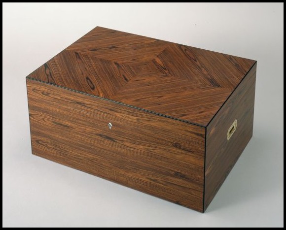 ![]() ![]() Humidor ChestThe chest top has a diamond pattern veneer in kingwood with an ebony inlay. All the fittings are brass with flush mounted handles. The escutcheons are mother of pearl. The humidor is finished with clear lacquer.The interior is lined with Belize cedar and has a lift-out tray and moveable partitions. There is a humitec and hygrometer fitted in the lid. Capacity: 350 x 7.5" cigars (approx) or 572 x 6" cigars (approx) |