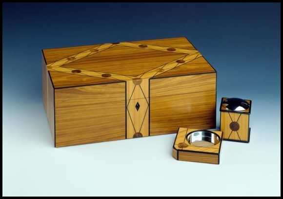 ![]() ![]() Oyster Humidor ChestThe chest is veneered in laburnum with a banding of satinwood inlaid with ebony and laburnum oysters. The escutcheon is ebony.The interior is lined with Belize cedar and has a lift-out tray and moveable partitions. There is a humitec and hygrometer fitted in the lid. There are accessories to match the humidor, namely an ashtray which has a silver dish set in the same materials, and a lighter with the mechanism again set in matching materials. The humidor and accessories are finished in hardwearing clear lacquer with a suede base to protect other surfaces. Capacity: 80 x 9.25" cigars (approx) or 112 x 6" cigars (approx). |