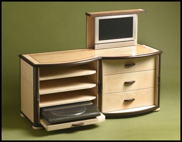 ![]() ![]() Audio-Visual CabinetThis cabinet is made from burr ash, maple and wenge. Between the burr ash and maple is a decorative inlay. At the front are tambour doors made of maple. The handles are wenge and the bun feet are maple.The interior has various items which it will accommodate. The left hand side has a turntable on a pull-out surface, compact disc player, video player and turner. The right hand side contains various drawers for the storage of CDs, videos and other accessories. Within the top is a Panasonic TX-15T2 widescreen television set, which moves up and down with the assistance of a pair of gas springs. The complete cabinet is finished with a clear satin matt lacquer. |