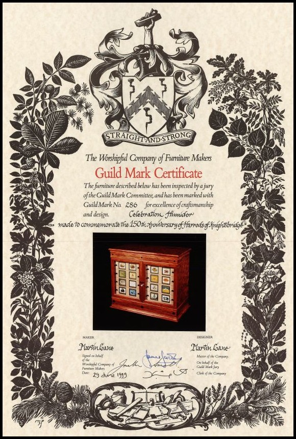![]() ![]() Guild Mark Certificate Number 286This Guild Mark was awarded to Martin Lane for the Celebration Humidor made to celebrate the 150th anniversary of Harrods of Knightsbridge. |