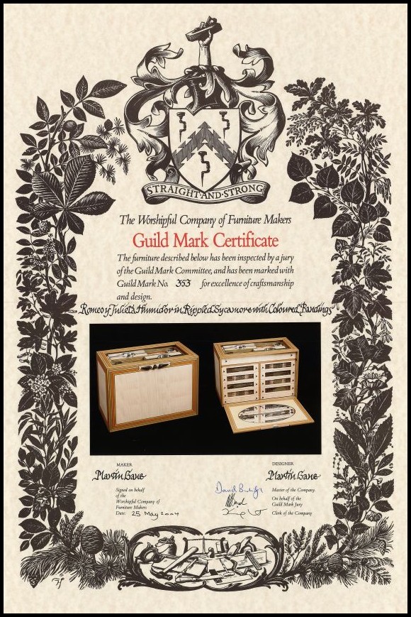 ![]() ![]() Guild Mark Certificate Number 353This Guild Mark was awarded to Martin Lane for the Romeo y Julieta Humidor in Rippled Sycamore with Coloured "Bandings". |