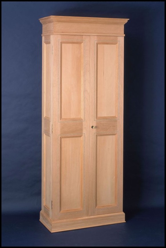 ![]() ![]() Humidor CabinetThis cabinet is made of Belize cedar and ebony in the mid-19th century style.From 1830, the banking firm of H. Upmann started shipping cigars, sealed in cedar boxes and stamped with the emblem of the bank for the use of their directors in London. Soon afterwards, the bank decided to go full-scale into the cigar business, and their brand is still available today. The cedar box became established as a form of packaging for all the major Havana brands and all handmade cigars. This cedar cabinet would have shipped 10,000 cigars as the original packing crate. Cedar helps prevent cigars drying out, and furthers the maturing process. The exterior is panelled with two doors at the front. An inlay banding outlines the panelled work, with a natural finish. The interior has adjustable slatted shelves. There is a slide out drawer at the bottom of the interior which accommodates the electronic humidifcation unit. A digital hygrometer is at the top of the right-hand door. The insides of the doors have Havana classic marques mounted behind chamfered glass and outlined with an ebony and cedar bead. All the fittings are solid brass. This piece was awarded a Guild Mark (number 264) from The Worshipful Company of Furniture Makers. This award was for excellence of design, materials, craftsmanship and function. |