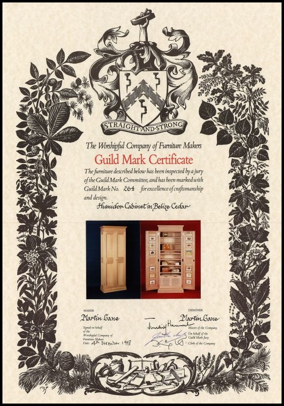 ![]() ![]() Guild Mark Number 264: Humidor CabinetThe Humidor Cabinet piece was awarded a Guild Mark (number 264) from The Worshipful Company of Furniture Makers. This award was for excellence of design, materials, craftsmanship and function. |
