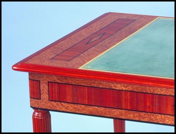 ![]() ![]() Writing DeskThis piece was designed from three photographs supplied by the client. Padauk is used for the turned legs and red timber, vavonar burr, ebony and boxwood are used to frame the pale green leather writing surface (skiver). The skiver had gold tooling to balance the border and boxwood inlay. It is finished with a clear lacquer. |